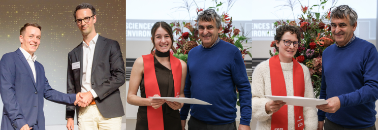 - Rosa Haffter (rechts; EPFL) wurde für ihre Masterarbeit «PFAS Contamination in Swiss Railway Infrastructure: Identifying Sources, Materials, and Analysing Potential Environmental Impact» prämiert. Die Arbeit basiert auf der Analyse von Geodaten zur Identifikation von Objekten, die potenziell hohe Mengen an PFAS freisetzen. Zudem wurden Materialien untersucht, die beim Bau und Unterhalt von Bahninfrastrukturen verwendet werden und in ökologisch sensiblen Gebieten PFAS freisetzen könnten. Die beiden Preise für die Arbeiten an der EPFL wurden von Félix Schmidt, Dozent an der EPFL und Senior Experte bei CSD INGENIEURE, überreicht.