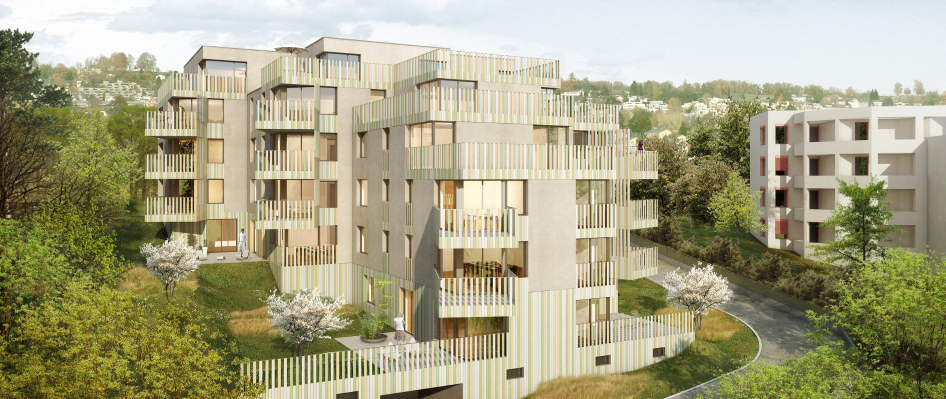 Die ZURICH IMRE AG hat an der Limmattalstrasse 1/3 im Stadtkreis 10 in Zürich, auf einem prominenten Grundstück mit steiler Südhanglage, einen Ersatzneubau realisiert. Das neue Mehrfamilienhaus wurde auf die bestehenden Einstellhalle gebaut. Das gestaffelte Bauvolumen setzt sich präzise auf die bestehende Struktur der Garage. Die Grundstruktur der insgesamt 21 Wohnungen, (2.5 bis 5.5-Zimmer) ergibt sich aus der konsequenten Übernahme der Statik des Untergeschosses. Die Wohnräume mit der Hauptausrichtung nach Süden sowie den expressiv auskragenden Balkone bieten einen phantastischen Blick auf den Zürichsee, die Stadt und das Limmattal.