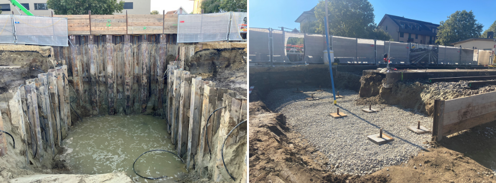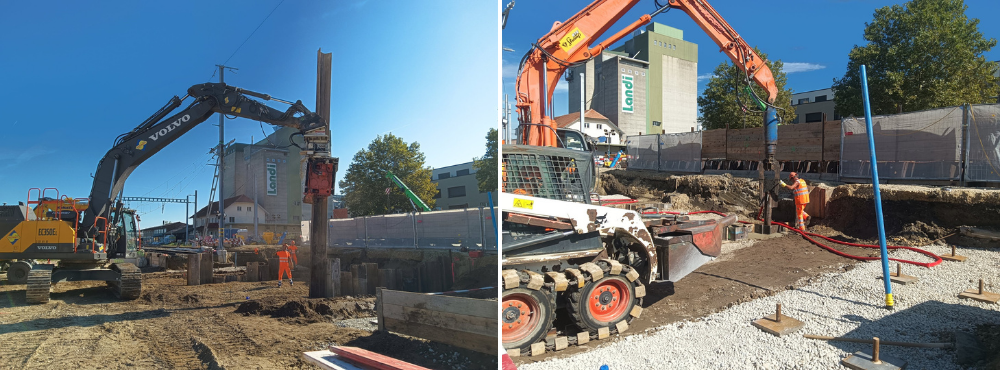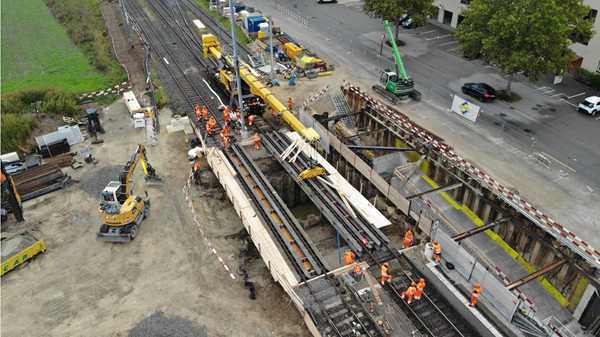Les contraintes étaient multiples : espace limité, impacts à minimiser, sur le transport des passagers, de marchandises et conditions hydrogéologiques complexes. Ces défis ont nécessité la mise en œuvre de travaux spéciaux durant le week-end, notamment la pose d’une paroi de palplanches de part et d’autre du futur passage inférieur avec l’installation d’un système de pompage des eaux souterraines.