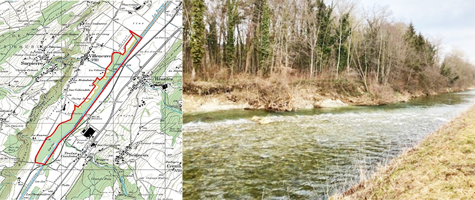 Périmètre concerné par le suivi (Office fédéral de la topographie; gauche); Broye revitalisée